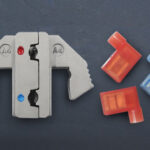 Het profiel is speciaal gemaakt voor het krimpen van rode en blauwe geïsoleerde vlag kabelschoen aan kabel van 0,5 t/m 2,5 mm2