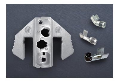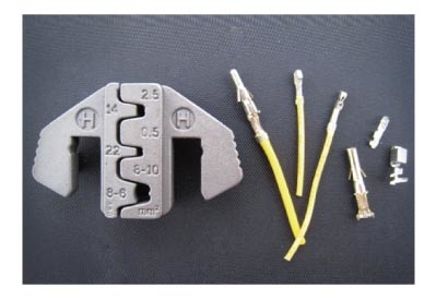 - Krimpprofiel A: Geïsoleerde kabelschoenen. Dit profiel heeft 3 aparte uitsparingen voor het krimpen van: Rode kabelschoenen 0.5 - 1.0 mm2 (AWG 22-18) / Blauwe kabelschoenen 1.5 - 2.5 mm2 (AWG 16-14) / Gele kabelschoenen 4.0 - 6.0 mm2 (AWG 12-10)