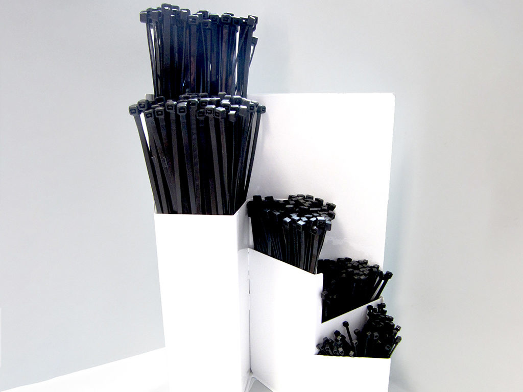 Sterk en handig opbergrek voor +/- 500 kabelbinders in 5 verschillende maten. Het opbergrek is gemaakt van gepoedercoat staal in de kleur wit en is gevuld met de onderstaande kabelbinders: