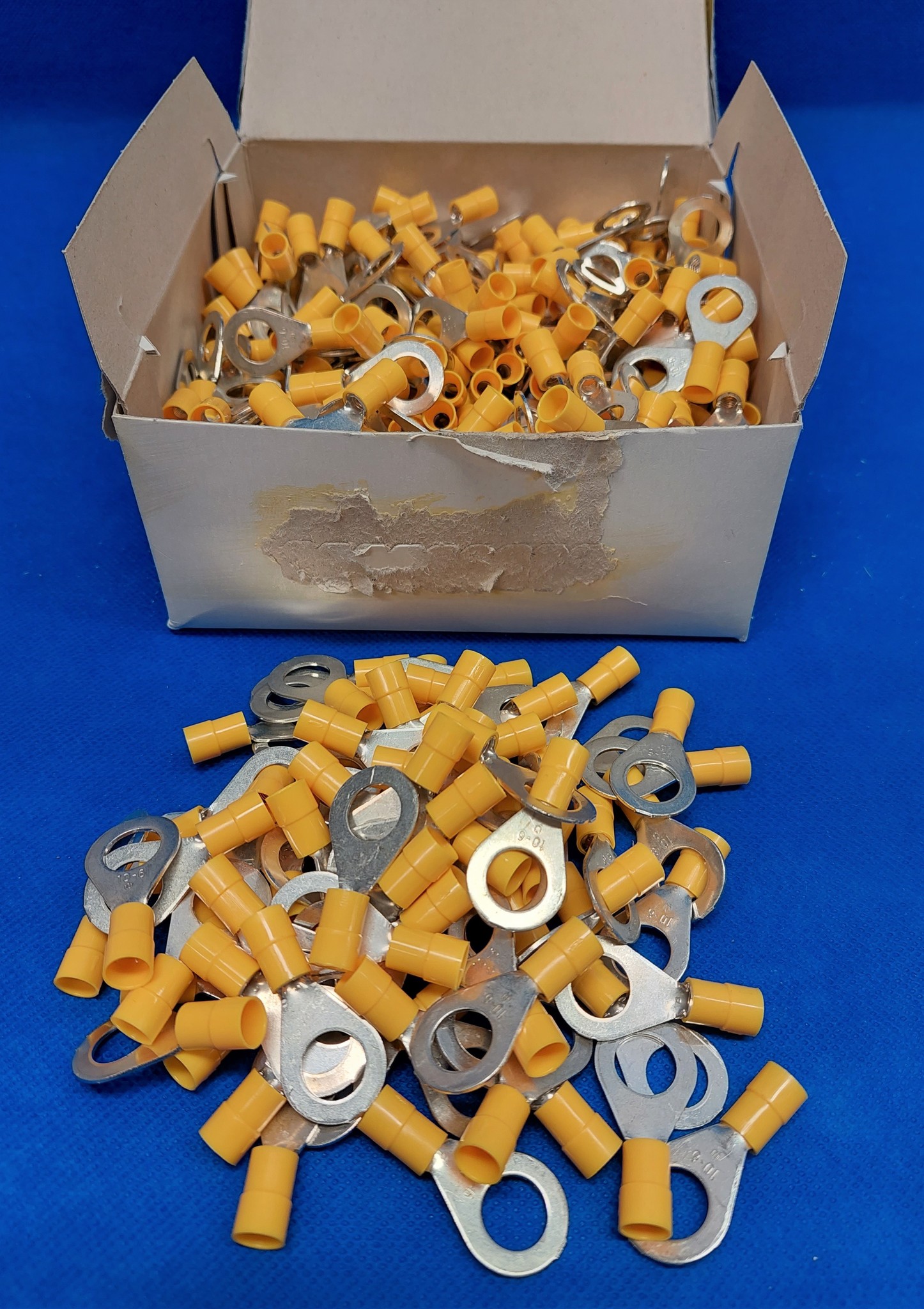 Doos met 450 ringkabelschoenen M10 van uitstekende kwaliteit. De isolatie van de kabelschoenen is gemaakt van PVC en het geleidende materiaal van elektrisch vertind koper.