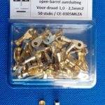 Ring M3 / kabeloog M3 van messing met open-barrel aansluiting voor draad/kabel van 1,0 - 2,5mm2 Per 50 stuks in handige verpakking met ophang-oog.