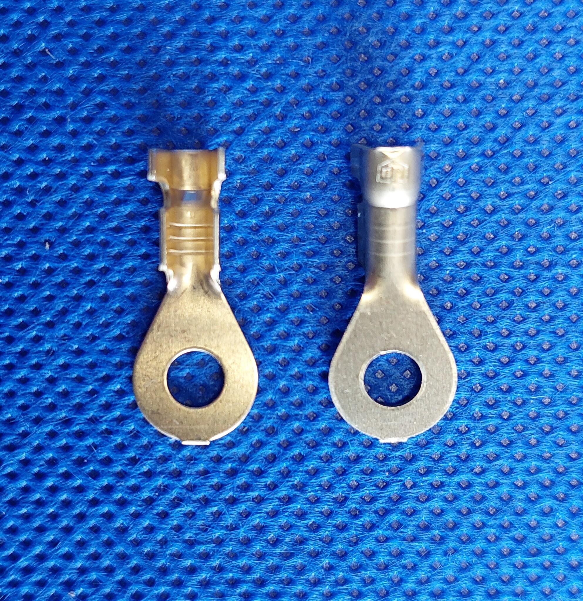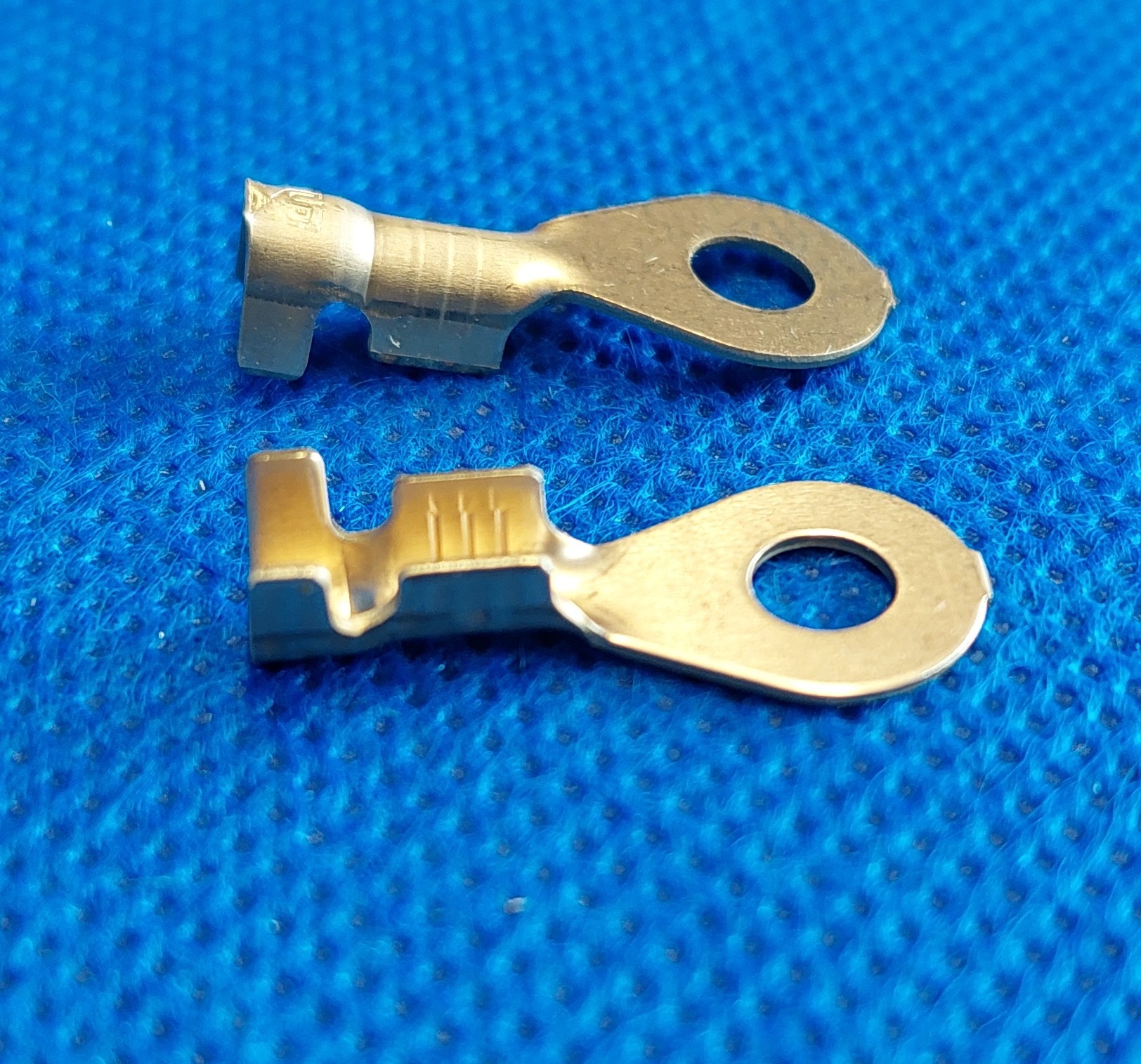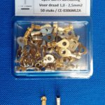Ring M4 / kabeloog M4 van messing met open-barrel aansluiting voor draad/kabel van 1,0 - 2,5mm2 Per 50 stuks in handige verpakking met ophang-oog.