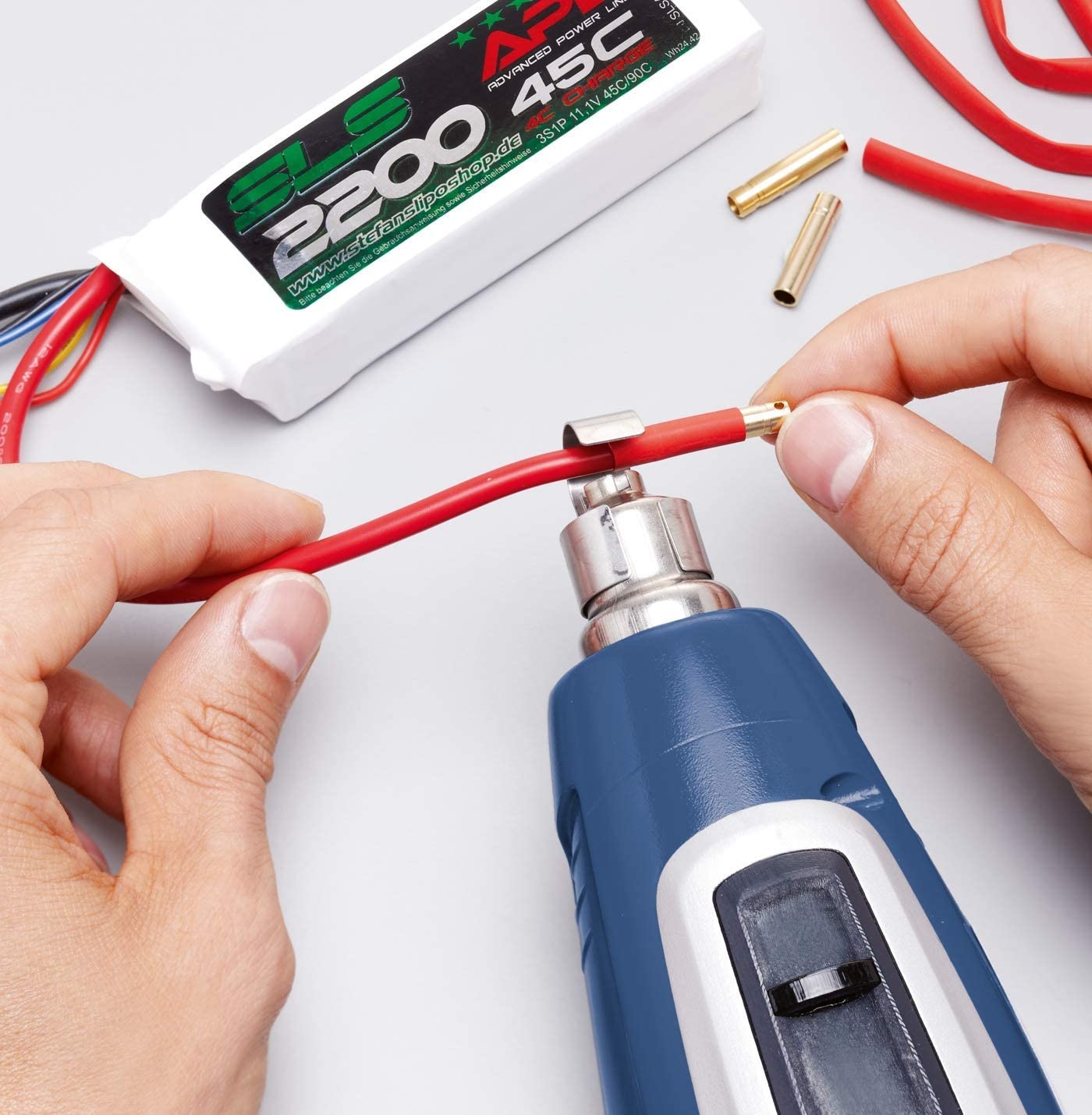 Dit heteluchtpistool komt door gebruik van het 7mm reduceer-mondstuk tot een werktemperatuur van 500°C en zonder mondstuk tot 400°C. Bij dit heteluchtpistool leveren wij 4 verschillende mondstukken: 2 reflector-mondstukken van 10 en 40mm. voor het verhitten van verschillende maten krimpkousen, een 7mm reduceer-mondstuk voor een verhoging van de temperatuur en geconcentreerde verwarming en een 4,5mm precisie-mondstuk om op de punt nauwkeurig te werken.