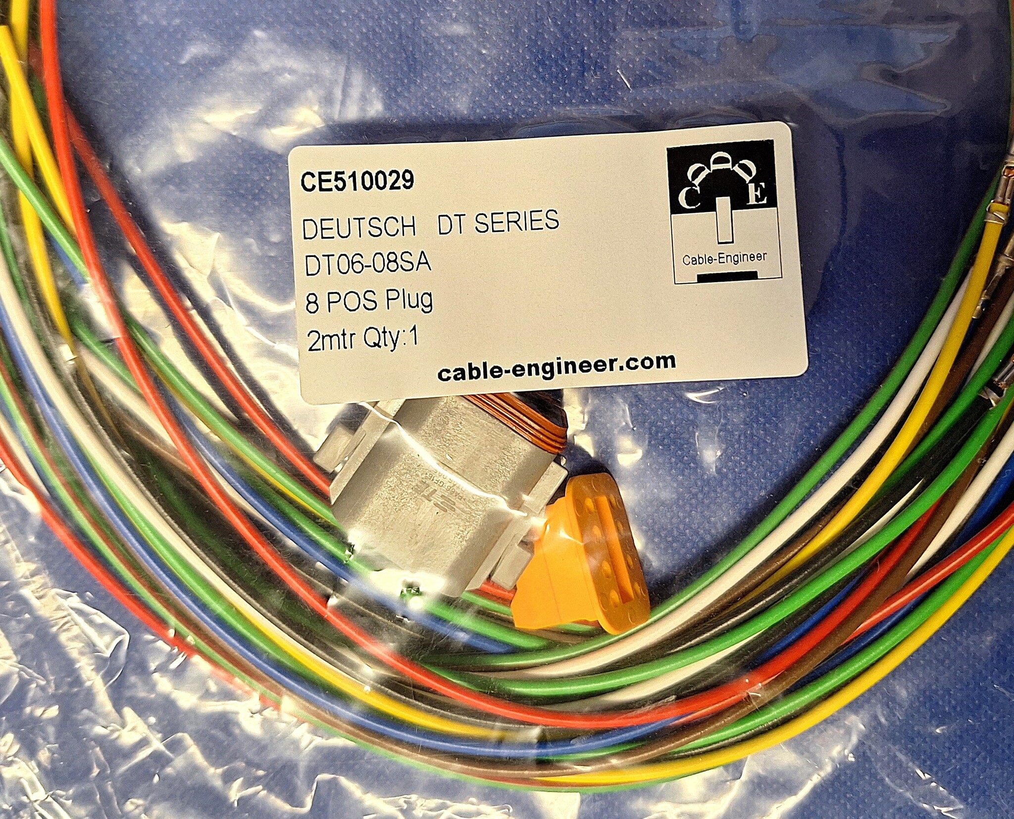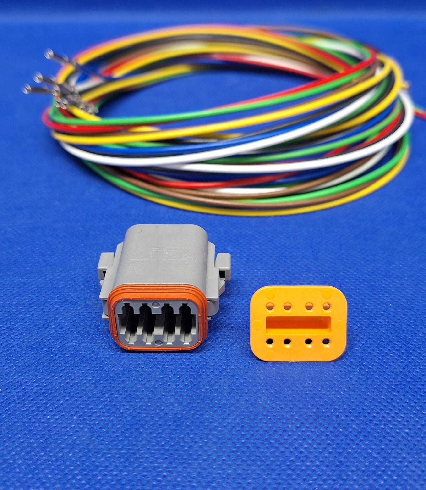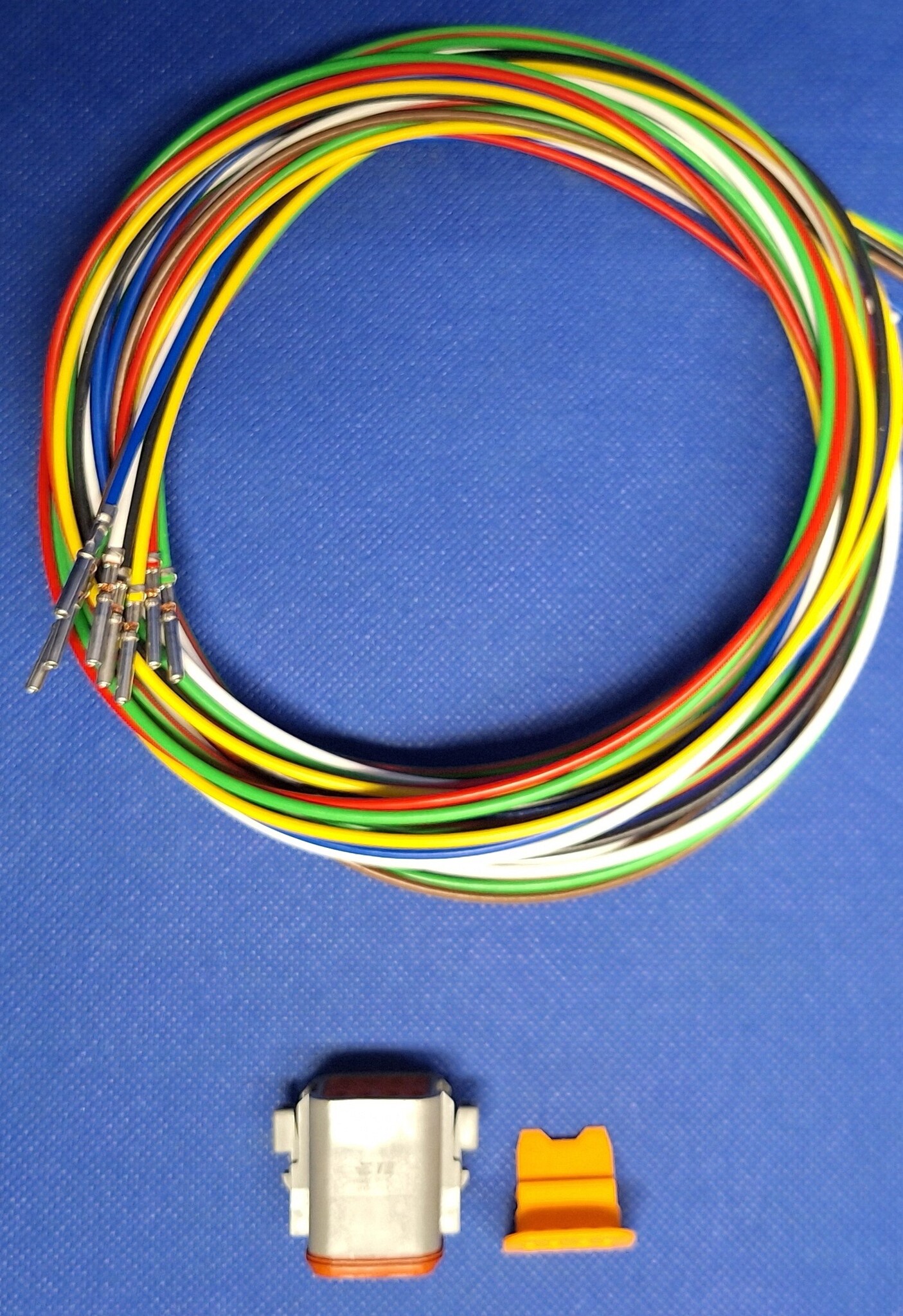 Complete Plug set met één Deutsch DT 8-Pos. Plug (man) DT06-08SA + 8x 2 meter 1,5mm2 FLRY-B kabel in de kleuren rood, zwart, blauw, bruin, geel, en rood/groen met professioneel aangekrompen vrouwelijke contacten(nikkel) en bijbehorende wedgelock voor het vastzetten en exact uitlijnen van de contacten in de behuizing.