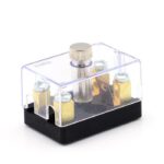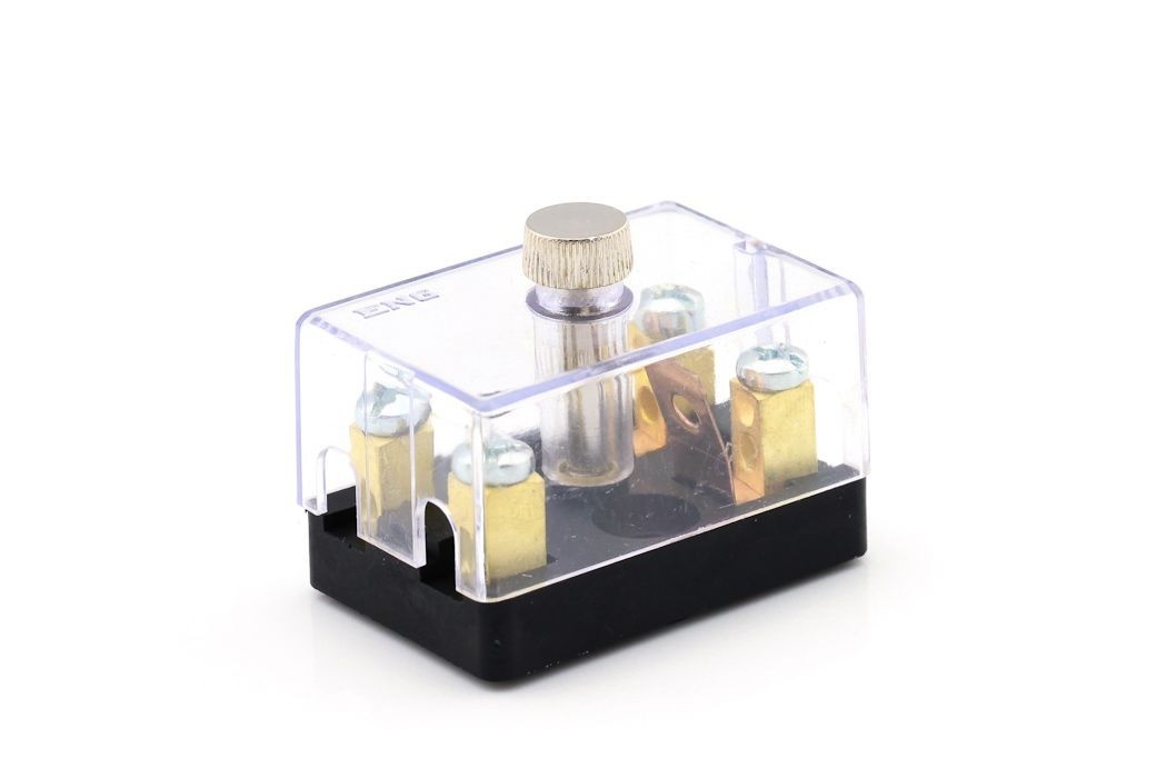 Zekeringhouder met 2-posities voor keramische- of torpedozekeringen. Sterke kunststof houder met transparante deksel met schroefsluiting.