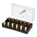 Zekeringhouder met 6-posities voor keramische- of torpedozekeringen. Sterke kunststof houder met transparante deksel met schroefsluiting.