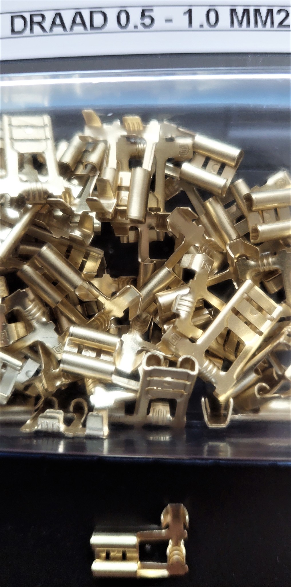 50 stuks ongeïsoleerde vlag-vlakstekerhulzen van messing 6,3 x 0,8 voor draden van 0,5 t/m 1,0 mm2.