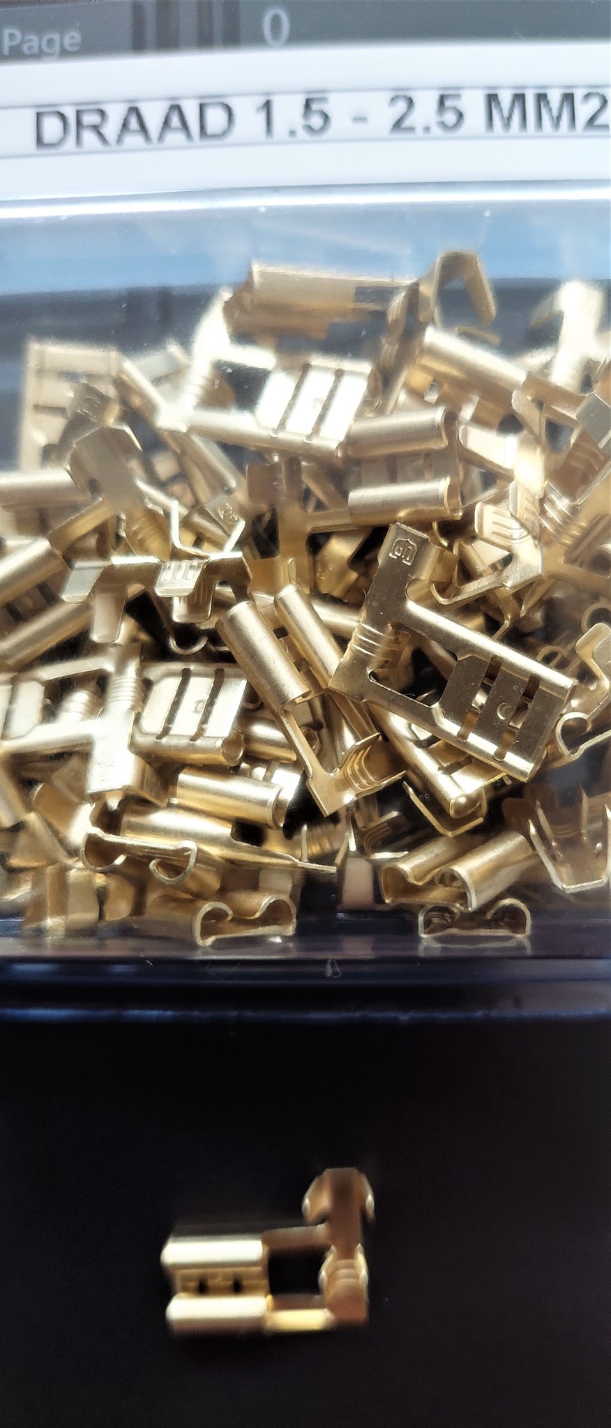 50 stuks ongeïsoleerde vlag-vlakstekerhulzen van messing 6,3 x 0,8 voor draden van 1,5 t/m 2,5 mm2.