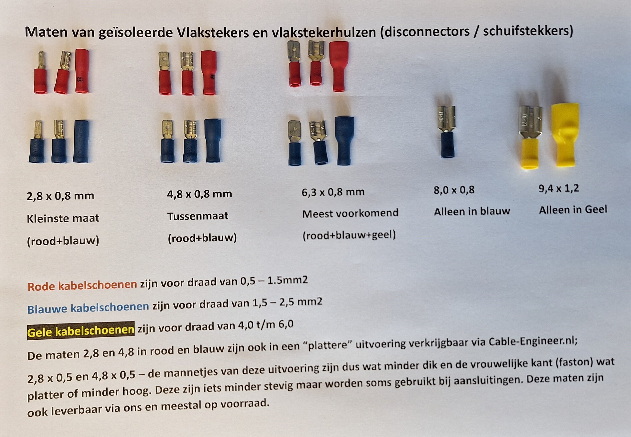 Dit type kabelschoen is ontwikkeld door TE (toen nog AMP) en werden toen Faston (vrouw) en Tab (man) genoemd. In de loop der jaren zijn daar vele namen bijgekomen en inmiddels heeft deze kabelschoen meer namen dan een doorgewinterde spion. Wij noemen ze vlaksteker (mannelijk) en vlakstekerhuls (vrouwelijk).