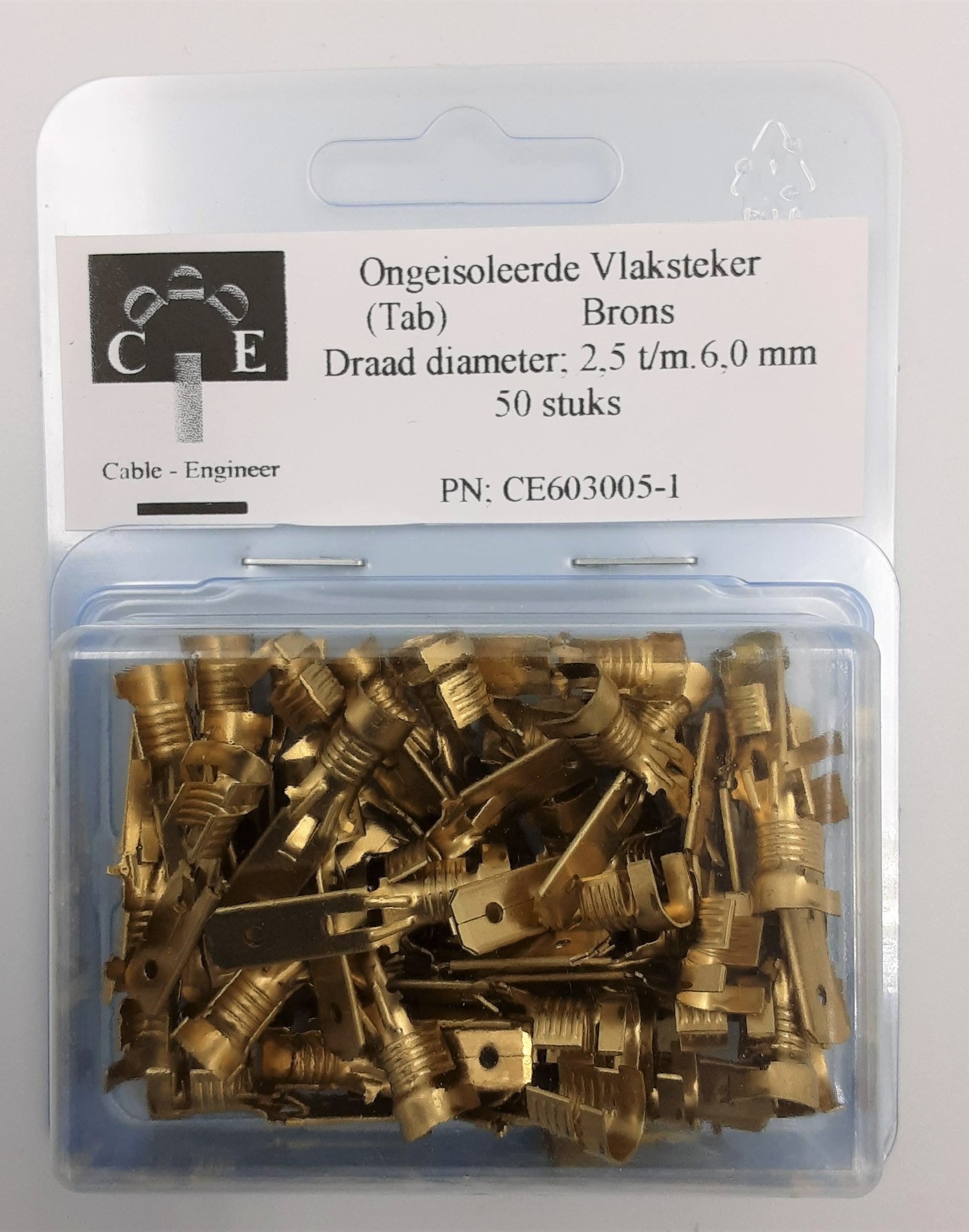 50x Vlakstekers 6,3 x 0,8 mm van messing met "open barrel" krimpaansluiting aan de draadkant voor draad/kabel/snoer van 2,5mm2 t/m 6,0mm2.