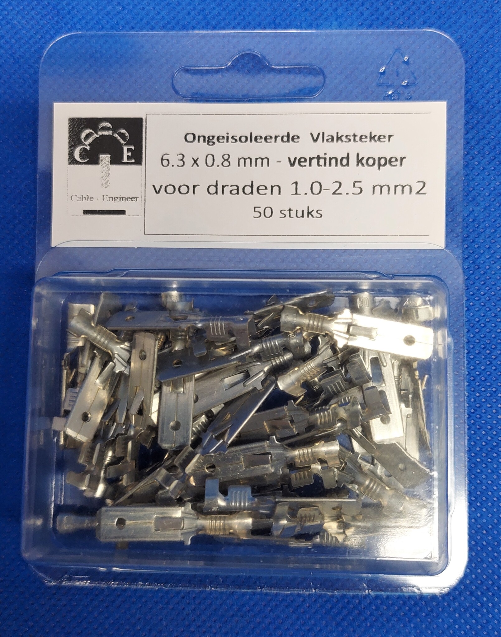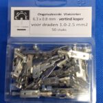 50x Vlakstekers 6,3 x 0,8 mm van vertind messing met "open barrel" krimpaansluiting aan de draadkant voor draad/kabel/snoer van 1,0-2,5mm2.