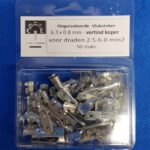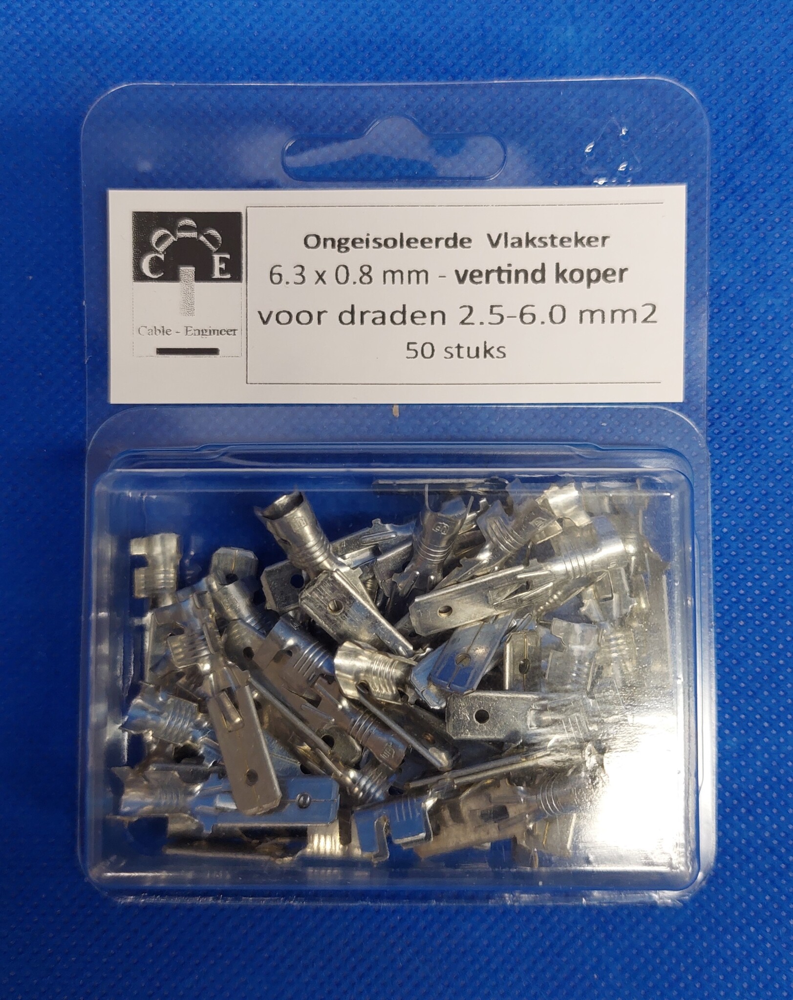 50x Vlakstekers 6,3 x 0,8 mm van vertind messing met "open barrel" krimpaansluiting aan de draadkant voor draad/kabel/snoer van 2,5-6,0mm2.