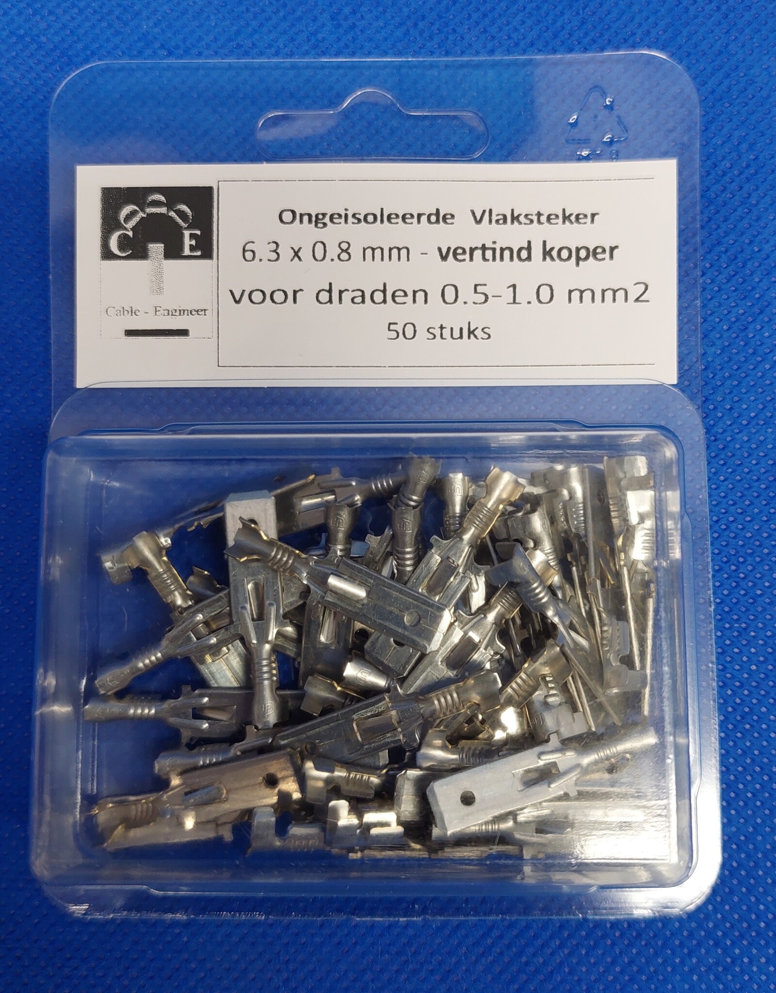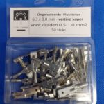 50x Vlakstekers 6,3 x 0,8 mm van vertind messing met "open barrel" krimpaansluiting aan de draadkant voor draad/kabel/snoer van 0,50 - 1,0mm2.