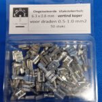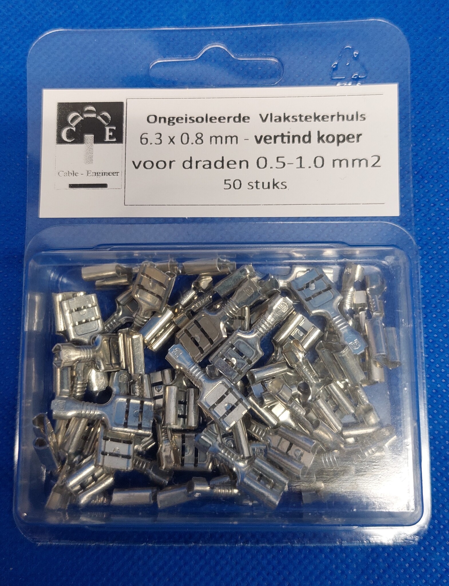50 stuks ongeïsoleerde vlaksteker-hulzen 6,3 x 0,8mm met "open barrel" krimpsluiting voor kabel van 0,50 - 1,0mm2 Materiaal: vertind messing