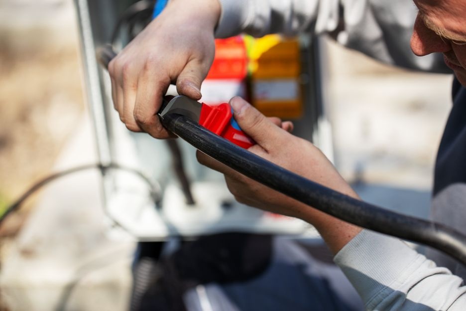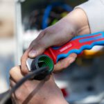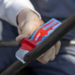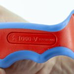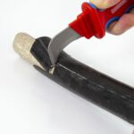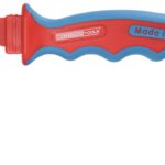 Professioneel "heavy Duty" kabelmes met bescherming tot 1000 Volt, beschermende geleide-voet voor de interne geleiders en extra beschermkap voor veilig opbergen.