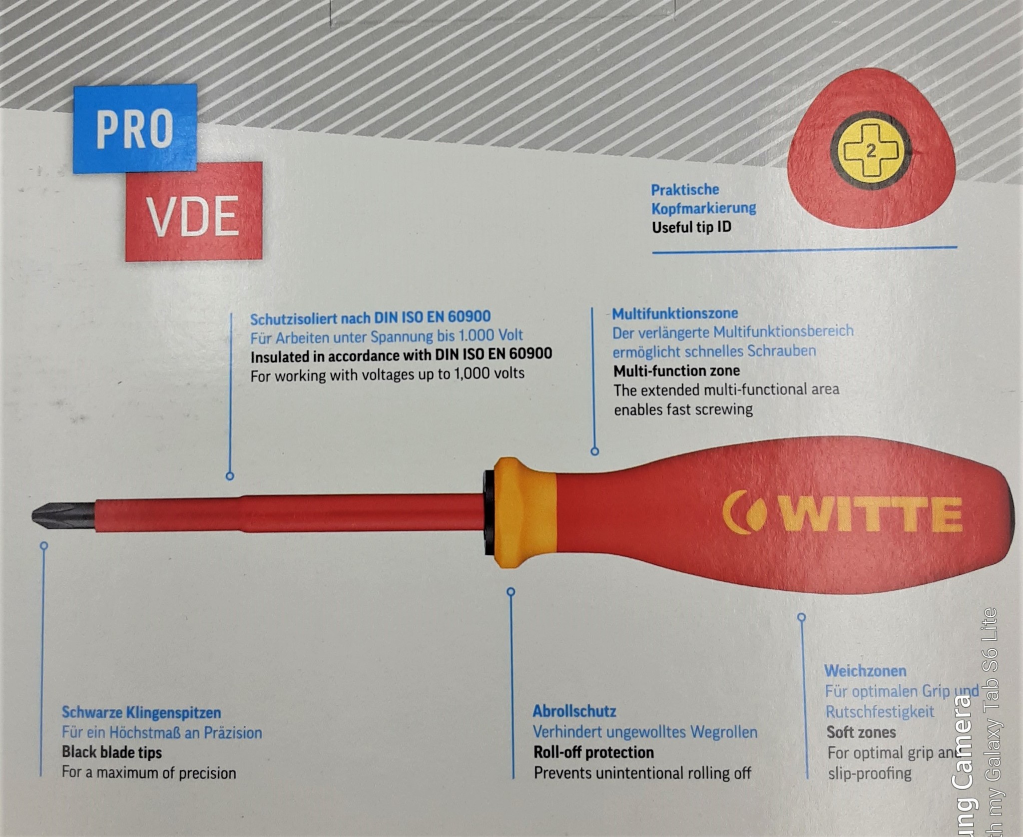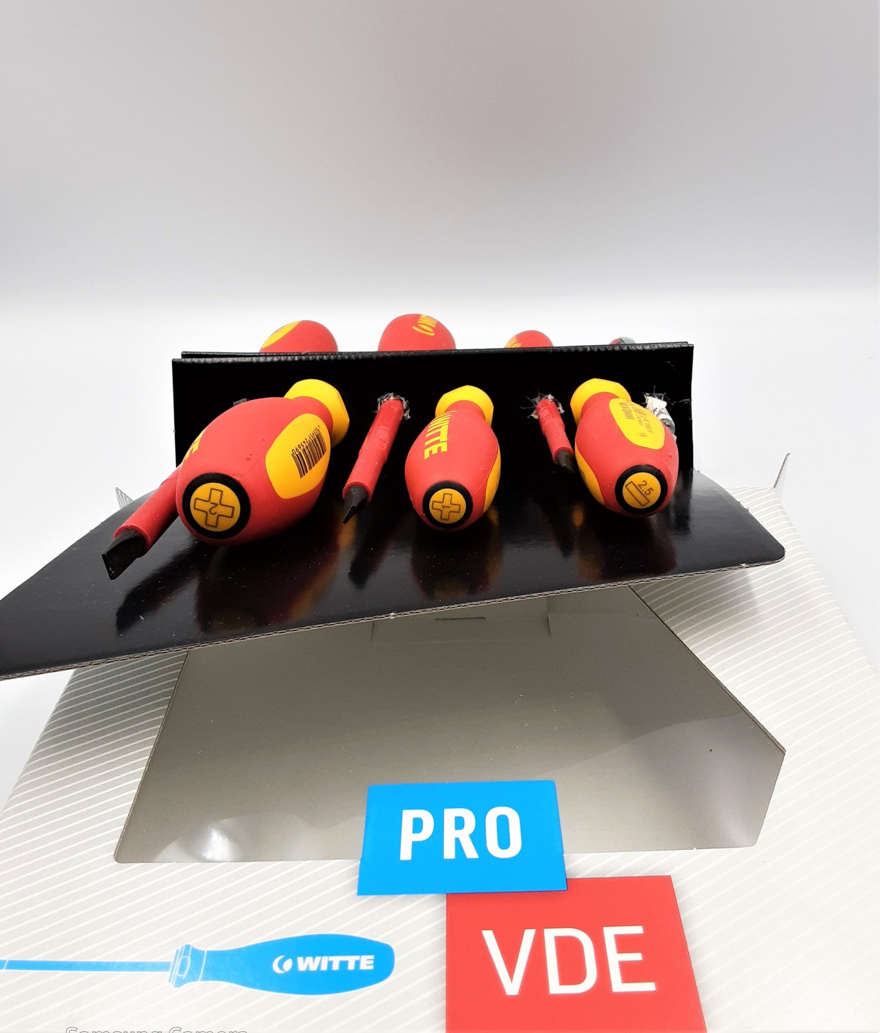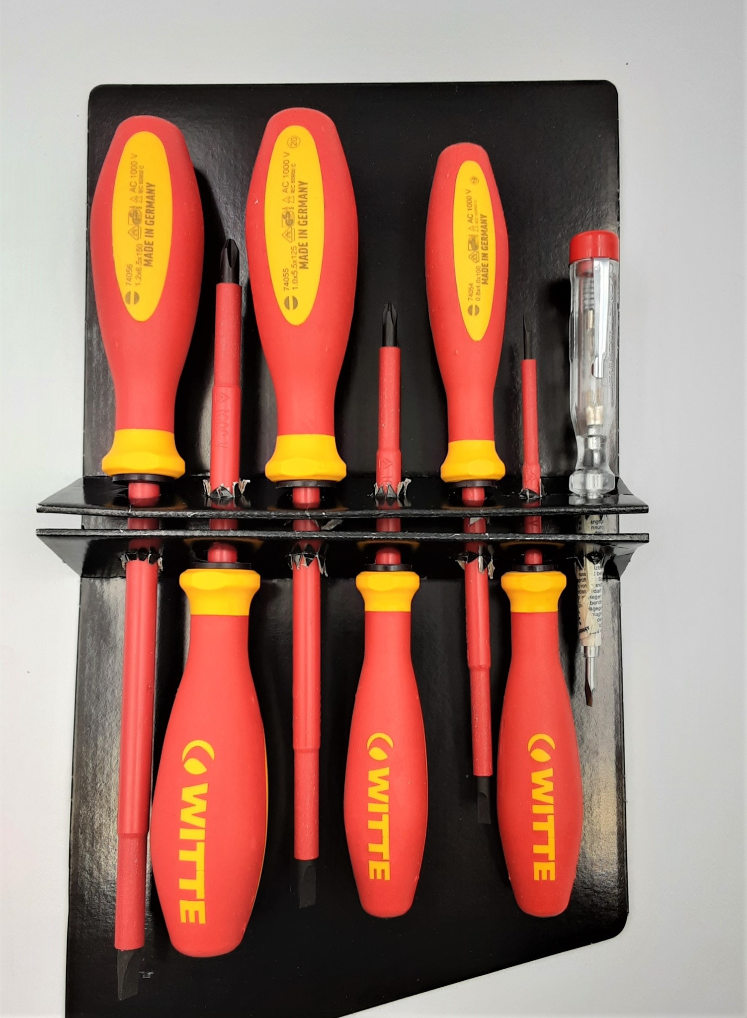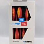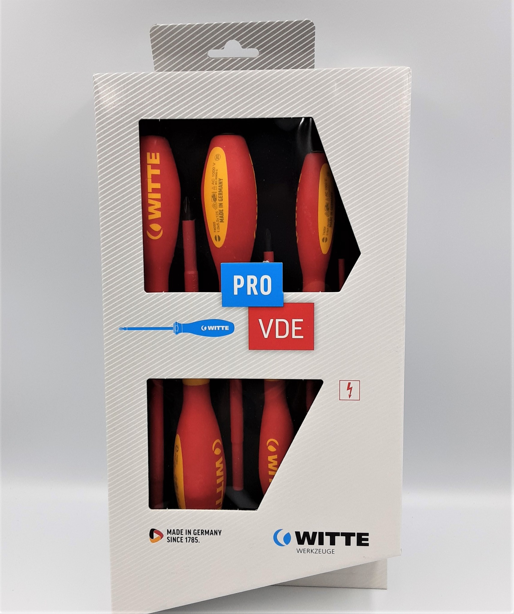 Deze complete set is VDE gekeurd. Bij WITTE Werkzeuge wil dit zeggen dat het gereedschap een hoogspanningstest in een waterbad krijgt waarbij zelfs tot 10.000Volt de diëlektrische sterkte van het gereedschap gewaarborgd moet blijven. Dit wil zeggen dat het zuivere materiaal getest wordt om te aan te tonen dat hij de maximala spanning kan weerstaan zonder te breken.